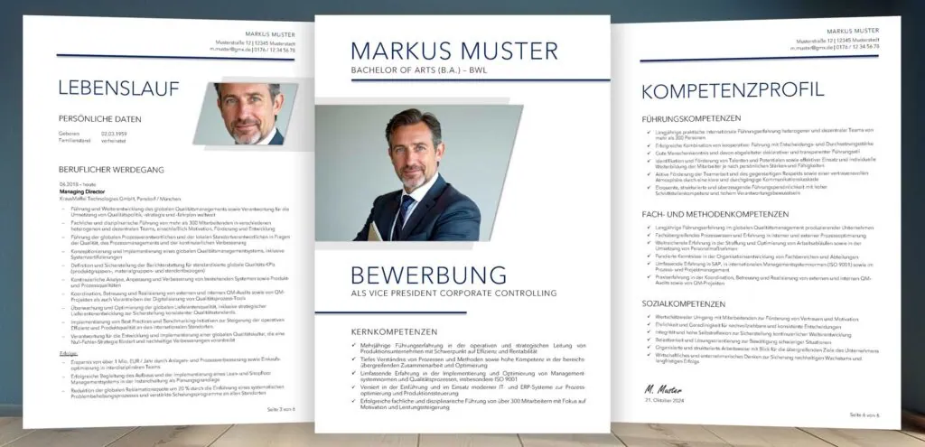 Unsere Bewerbungsunterlagen stellen Ihre Führungsqualitäten in den Mittelpunkt und positionieren Sie erfolgreich an der Spitze Ihrer Branche.